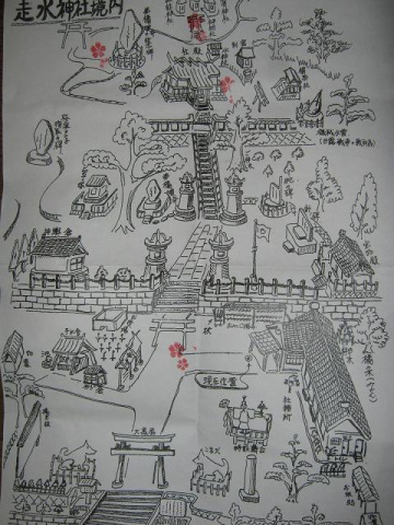神社に行くと「ご自由にどうぞ」と書かれた箱の中に 神社の地図と江原さんがお勧めするスポットに花印が押された紙がありました。