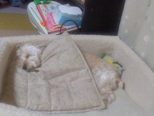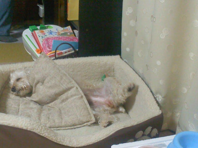 守山の友達の家に来ています。夕飯が済み、愛犬のココちゃんは眠りに就きました。熟睡してます。アラレも無い寝姿に!