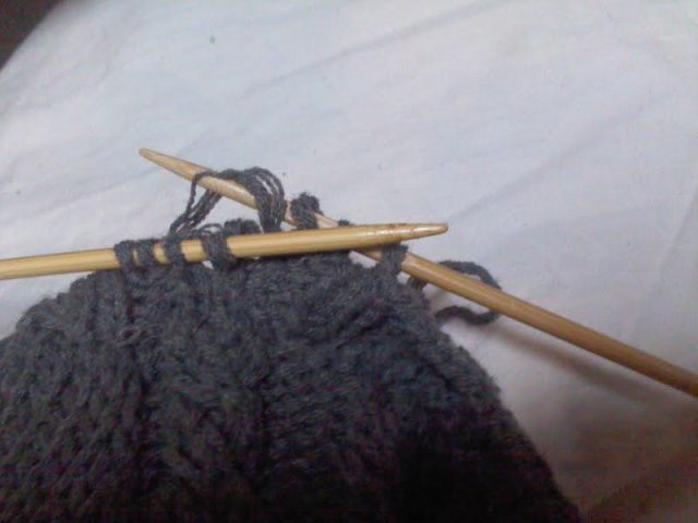 まず 落ちた目を何段か下まで遡って拾って棒針にかけます