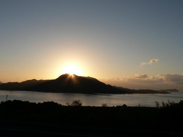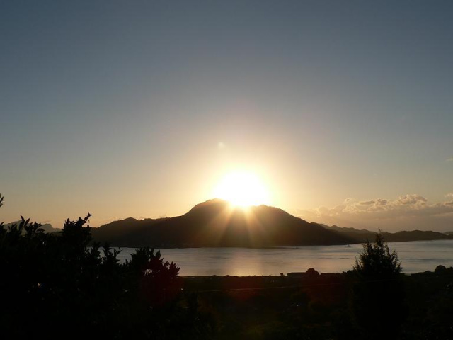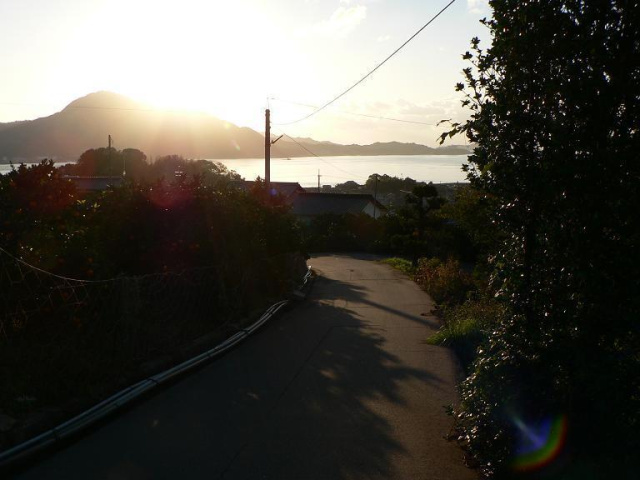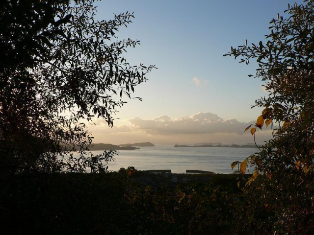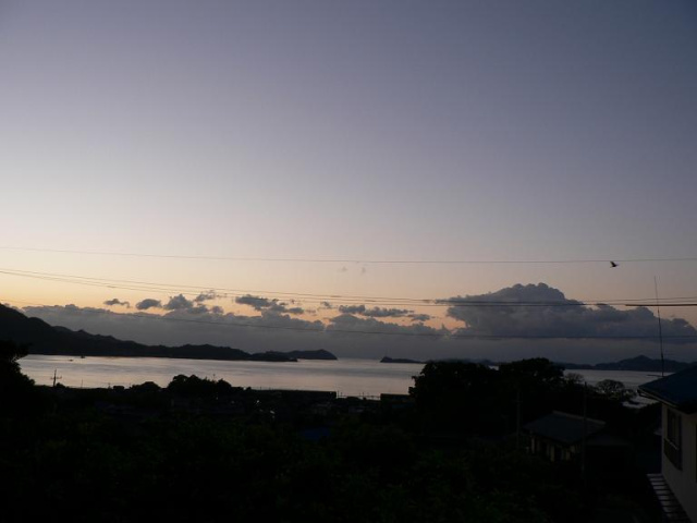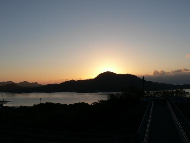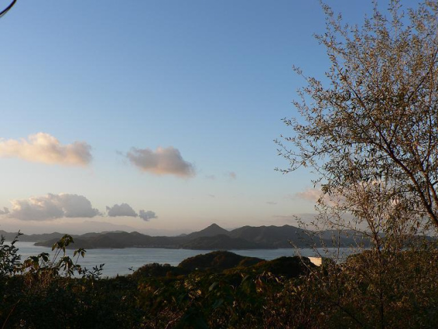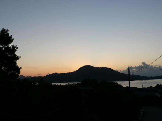向いの岩城島の山の向こうが薄っすら茜色です [d136]