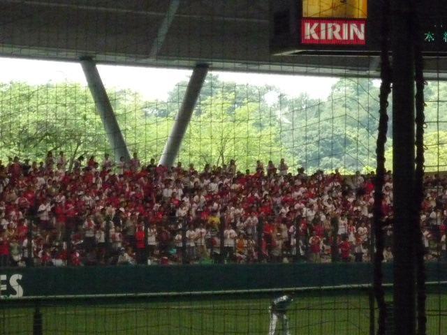 今日は…まず外野席の人大杉にビックリ。椅子の殆どない外野席、花見みたいにシートを引いて座るんだけど、本当に人びっしり!