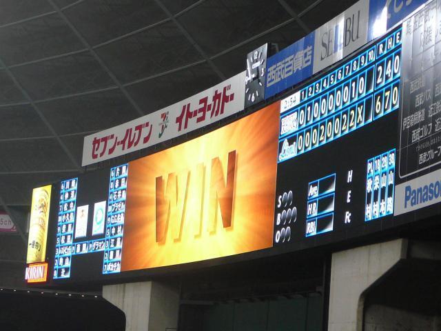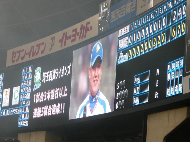 ライオンズは2回に小久保選手の本塁打で先制されるも、4回に片岡選手の今季初本塁打と中島選手の本塁打で逆転。7回には中村選手と江藤選手の連続本塁打で追加点。8回に1点を返されるもその裏には連打でだめ押しの2点で試合を決めた。