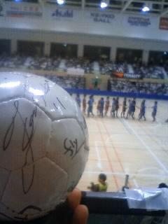 あいけんさんが、あのファルカンのサイン入りボールを提供してくれました。これに代表戦で高橋健介・原田公平両選手のサインに、たまたま外に居た稲葉・中島両選手のサインと谷本さんにも寄書きして頂きました→自分が欲しかったです(笑)