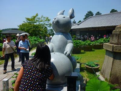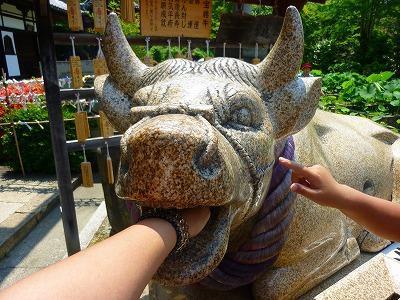 お堂のヨコに有名な牛がいます。牛の口の中に石がはいっていて触ると・・・
