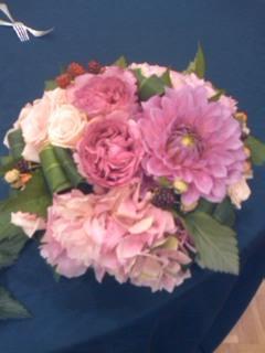 可愛らしいピンク系ですが、ダリアと斑入りの葉を入れることによって少し和の雰囲気も!