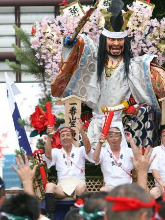 福岡・博多の夏を彩る祭り「博多祇園山笠」の山車を市民にお披露目する集団山見せが13日、福岡市内で行われ、プロ野球ソフトバンクホークス会長の王貞治さん(69)が、山車の上に乗って担ぎ手の男衆を激励する「台上がり」を務めた。