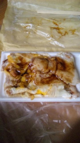 試しにお昼ごはんに買ったよ[d145]お好み焼きとクレープの合いの子みたいな感じ[d1024](いか・玉子にしたんだけど) ちょこっとソースが辛かった[d1032]