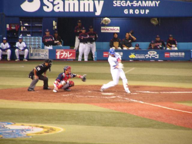 最終回、シコースキーからライト線ヒットを放つ金城。でもこのあと代走下窪がムラタのセカンドライナーで飛び出し併殺。。(セーフにみえたんだけどなあ)