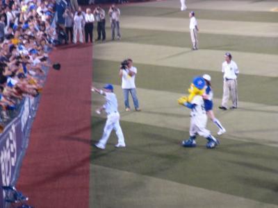 終了後のヒーロー選手のサインボールプレゼント&ハイタッチ。グローブや帽子を投げ込んでくれる時も。
