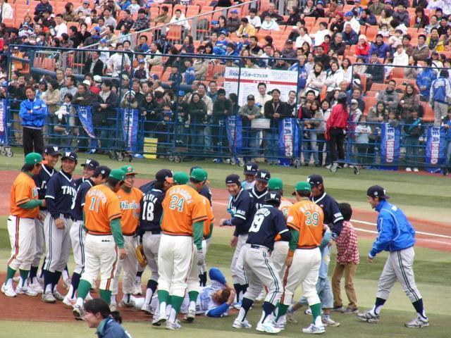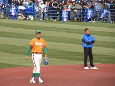 【青白戦」オールドユニが懐かしかった!おしゃれなベイユニで見慣れた選手が着ていると違和感ありますが、村田選手や種田選手はやけに似合ってました。そして湘南カラーといえば田代2軍監督。なつかしー、かっこいー。他にもスーツ姿の宮内元選手、革靴の川端元選手、審判から急遽登板のジーンズ姿の五十嵐元投手など懐かしい面々の飛び入り参加がとても楽しかった。それからジョーダンズ山崎さんが飛び入り代打〜三浦投手との対決〜デッドボール〜乱闘〜胴上げ〜退場もお決まりながら面白かった。