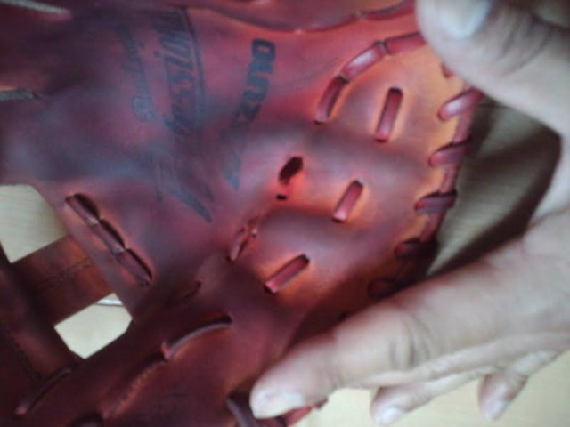 そして今回紐が切れた2代目を9年前に購入するわけです。当時は主にサードを守っていてたのですが、店ではめてみてしっくりきて、遊撃手のわりに深いという事で『二岡モデル』を購入しました。