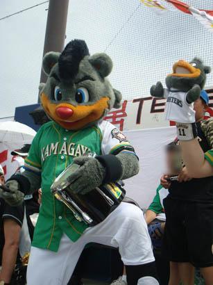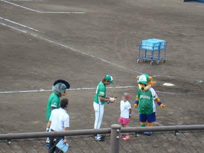 21日海の日は、カビーの誕生日ってことでヤクルト監督からヤクルト製品詰め合わせを、日ハム水上監督からは中華製品(だったかな?)をプレゼントされてました。去年はお菓子詰め合わせをもらい観客の皆さんに配布があったようですが、今回はカビーが「やだやだ!」と駄々こねたので、配布はなかったですね。(笑汗