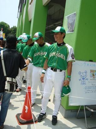 12時の開場より少し早めにゲートが開きました。すでに入場待ちの列は球場を1周するほどまでになっていました。いつもならチームマスコットのカビーがお客さんを出迎えるのですが、今日ばかりはコンコースにズラッと選手が並んで迎えてくれました。一番手前にいたのが、水上監督。あとで知ったのですが、中田選手も並んでたみたいですね…………。気がつきませんでした。(汗汗