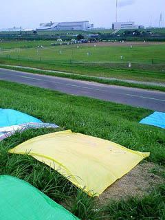 先に書きましたとおり、板橋は花火大会で夜は地元の友人達と見に行く事となっていました。用事があって9時ごろ浮間舟渡駅まで行き、帰りになんとはなしに河川敷をのぞいたらわりと空いていたので、ビニールシートを調達して場所取り。写真真ん中の黄色いシートがそうです。河川敷のグラウンドは区営はNGでしたが、どこかの学校が占有しているグラウンドは、普通に野球の練習が行われていましたね。