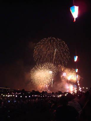 練習が終わって、メンバーはみな更衣室のシャワーに行きましたが、自分は車ですぐに撤収。一度家に戻って車を置いて、花火大会会場に向かいます。うっかり着替え忘れて練習着のパンツに青のベーシャツってスタイルで…………。周りに浴衣姿が多かっただけに、逆に目立った気がしないでもないですな。(笑汗