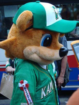 グラウンドの外に出れば、いつものようにカビーがバス乗り場までやってきてお客さんの見送りに。ふと見れば、右腕のところにリボンがついていて「誕生日おめでとう」の文字が。前日までも3歳でしたが、この日も「3歳の誕生日」なのでした。サザエさん形式なのかな…………。(苦笑