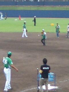 内野体験は市川選手と今波選手がお手本に。内野では3回自分に順番が回ってきました。捕ったらファーストで待ってるスタッフさんに投げるのですが、概ねきちんと捕球することができました。写真はスタンドで荷物番してくれていた友人が携帯で撮ったもの。うーん、腰が入ってないなぁ………。