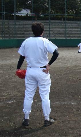 準備運動の最中に、球場に近づいてくるスーツ姿の男性が………。「………どこぞの企業の課長さん?」と思ったらチームメイト&マイヤキューのひろしのしんさんが。(笑