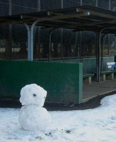 グラウンド整備が終わってみんなが撤収準備始めたところで、キャプテンのお連れさんがサードベンチあたりに残ってた雪で、チームのマスコットキャラクターを作ってくれました!(笑