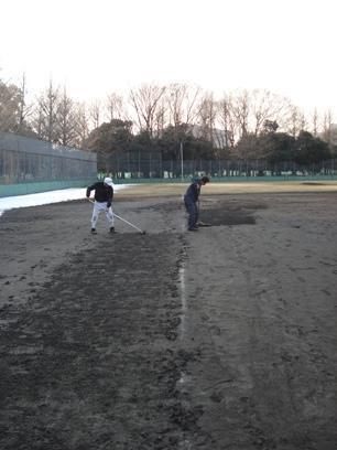 使用時間終了前にみんなでグラウンド整備。トンボ(?)とか使い方がわからなかったので、教えてもらいながら均したんですが………あまりちゃんと出来なかった気がします。スミマセン…………。(汗汗