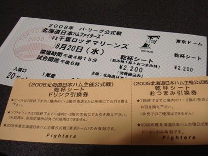 8月19・20日のファイターズ対マリーンズ戦はぜひとも観にいきたいと思っていたので、足を伸ばしたついでにとチケット購入してみました。8月20日の乾杯シートです。