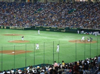 マイヤキューのジャイアンツファンの皆々様とご一緒させていただいたのですが、仕事終えた社会人が入場したのが18時半ごろ。バックネット裏付近のいい席は、16時の開場直後に埋まってしまうんでしょうねぇ。おまけに夏休みということもあってか、野球のユニフォームを着たちびっ子たちがわんさかとおりまして。どう見ても大人より子供のほうが人数多いなぁといった感じでした。1塁側内野は一通り埋まっており、3塁側になんとか場所を確保して観戦となりました。