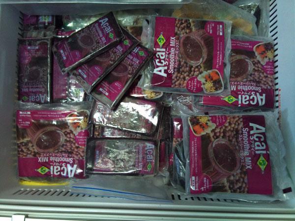 色々な飲み方があるんだけど、垣本家ではアサイーにバナナと牛乳とハチミツいれてミキサーにかけるだけ。