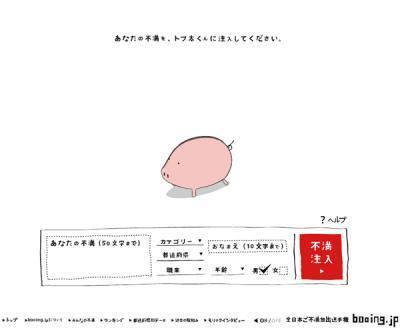 不満の表明は簡単で、サイトにアクセス後、50文字以内で不満を書き込み、ペンネームを「おなまえ」欄に記入の上、「カテゴリ」「都道府県」「職 業」「年齢」「性別」を選択し「不満注入」ボタンを押し、トブ太くんの震えるタイミングを見極めてクリックしてあげればよい。無事、トブ太くんが着地する と、「飛距離」と「順位」が表示されるという。