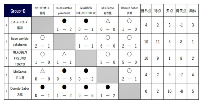 2チームが勝点と得失点差で並んだ為、第3条件の総得点が2点下回ったグラオベンフロイント東京が2位になってしまいました。
