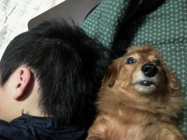 既に息子が起きていたが、居間のこたつでワンコと転た寝していました。