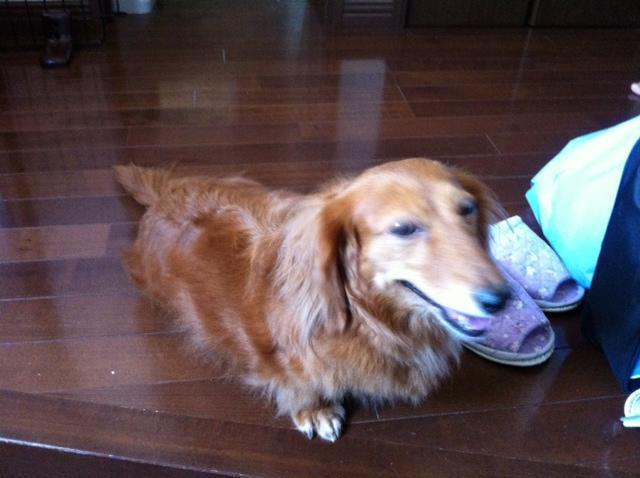 連日の暑さで、りんは自宅のフローリングでおなかをつけて