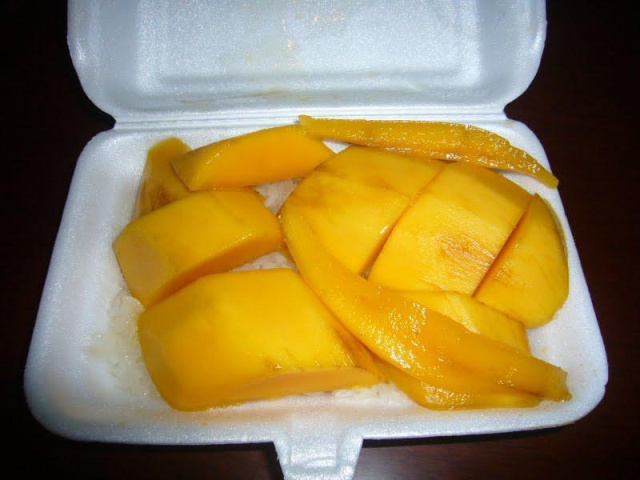 蒸した餅米にココナッツミルクをかけ、熟したマンゴーと食べます。