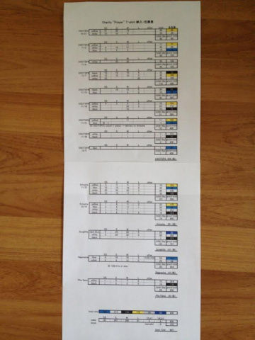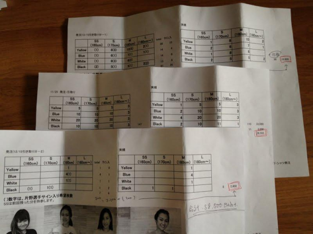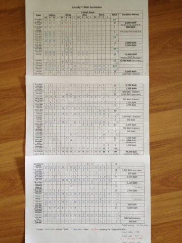 タイで販売したチャリティーTシャツの値段は300Baht(×695=208,500Baht)です。内150Bahtを義援金として寄付致しますので、義援金総額は『104,250Baht』です。