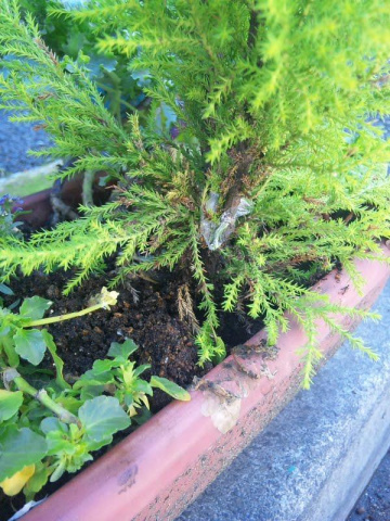 で、昨日の強風で花壇がひっくり返って、逆さまになっているのを発見して元に戻したのですが、名前は知らないんですがゴジラの背中みたいな植物の幹が真っ二つに折れていて