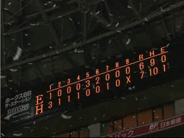 ヤフードームに白雪のように舞う鷹の形の紙吹雪