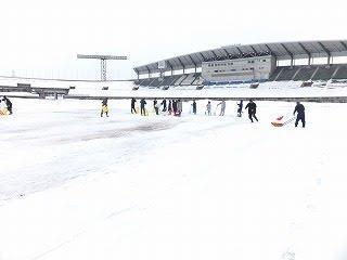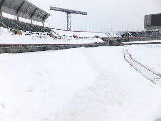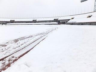 アウェー側スタンドは雪で埋もれてますw陸上トラックの外側は詰まれた雪で