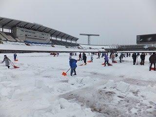 ↑ピッチ外(陸上トラック上)に雪を置いていきます