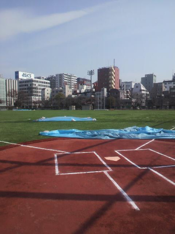 人工芝の全天候型の野球場であるがちょっと芝が長過ぎるような気がする。