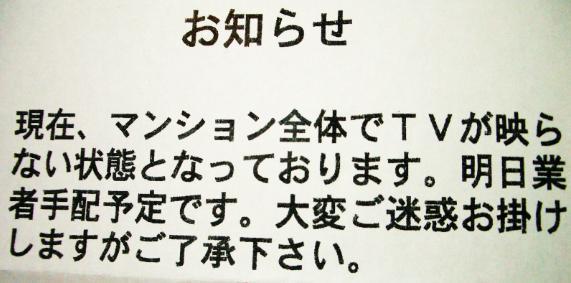 マンションの掲示板には特に復旧連絡も詫び文も掲載なし。誠意なし。