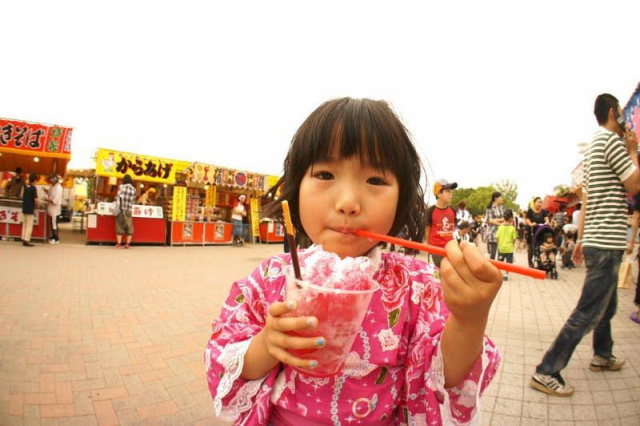むすめさん、着いて早々かき氷ゲット[d87] なんかポッキーとかのっとります[d230]