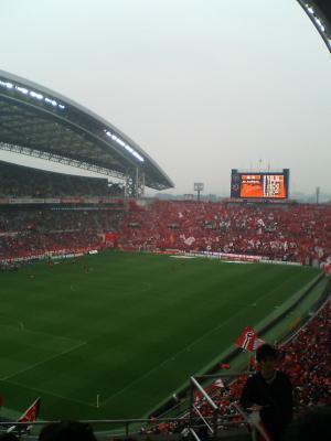 連れの付き合いも兼ねて(ナビスコ付き合ってもらったお礼)、3ヶ月ぶりの埼スタ、いつもどおり「東浦和」からバスでスタジアムへ。雨降ってたからなのか何なのかよく分からないけど、他の道からの合流での渋滞でいつもより20分ぐらい余計にかかってスタジアムに到着。でもその間いつの間にか寝てしまい大して時間がかかった感じがしませんでした(^_^)v 時計見て知ったもんで・・。若干早めに家を出てたんで試合開始前には程よい時間で着きました。