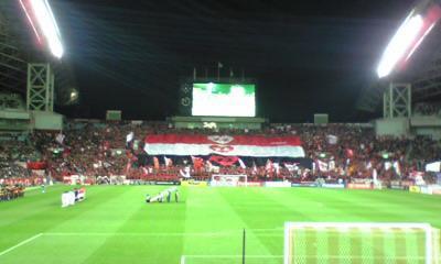 予定より30分遅れで会場IN。今回は埼スタ初の自由席!初なもんで今まで知らなかったんですが、レッズのHOMEの自由席のエリア、広いです!メインスタンドから見て左側のゴール裏はどこのチームも大体HOME自由ですが更に+α バックの前段・AWAY側のゴール裏(メインスタンドから見て左側)もHOME自由席で座れるなんて。レッズの人気ぶりがよ〜く伺えます。AWAYの自由席はほんのちょこっとしかないと思った方がいいかもしれません。肩身狭いっす・・・。駒場でも孤島に追いやられてるように見えたもんなぁ・・・。