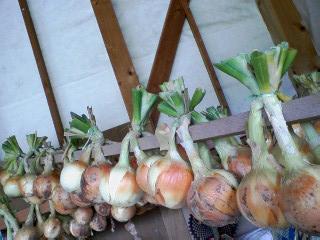 玉ねぎ収穫して軒先に干しました。