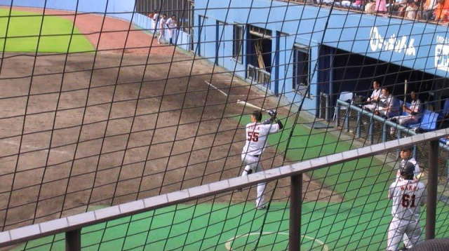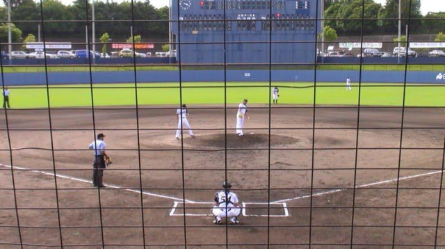 立岡::初球あと数十センチでフェンスオーバーの大きなレフトライナー(高めストレート)