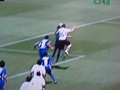 7分 右サイドからのサンガ徳重のFK。アンドレがヘッドで押し込む。ゴール!!逆転2−3