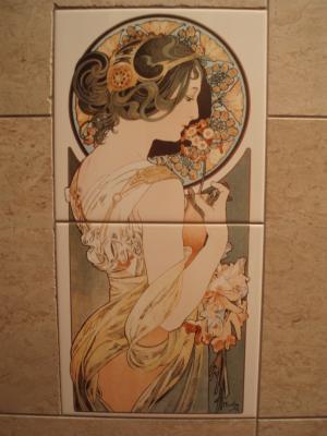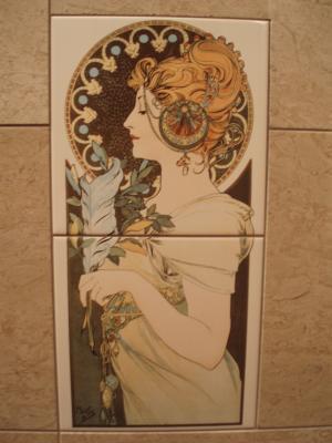 リフォームした際、玄関の壁を大理石張りにしてミュシャのタイルをはめ込んでみました。写真が小さくて分かりづらいでしょうが、いかがなものでしょう!