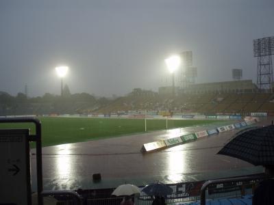 雨天でのゲーム。ボールが落ち着かず両者膠着状態。