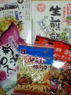 前の日記にも出たお土産の他に会社に配る柿ピー、ホワイトチョコがついた柿の種、駅の売店で気になって最後に買ってしまった生煎餅