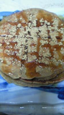 今日の朝ごはんは黒胡麻きな粉のパンケーキ黒みつがけを作りました。