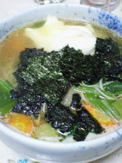 冷蔵庫にあったほうれん草、大根、ニンジン、ねぎ、鶏肉、そぼろ、卵を入れて作ったあったかそうめんです。